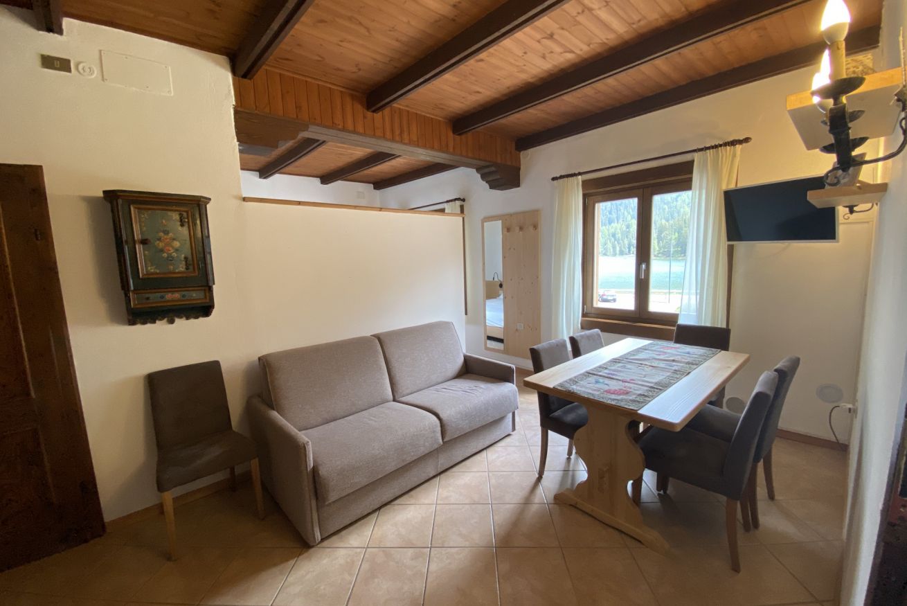 Appartamento bilocale, adiacente all'Hotel Sorapiss completamente rinnovato e fronte lago, in grado di ospitare 5 persone, ti permetterà di scegliere una vacanza in piena autonomia, con la disponibilità di tutti i servizi di Ristorazione dell'Hotel Sorapiss a pochissimi metri di distanza!
